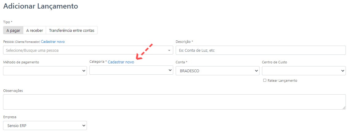 Na seta abaixo, você pode ver que terá essa opção cadastrar novo do lado da Categoria: