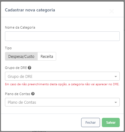 Pronto! Agora é só você preencher com o Nome da Categoria, o Tipo, Grupo de DRE (Grupo da Demonstração de Resultado de Exercício, relatório gerencial que evidencia o lucro/prejuízo da empresa) e o Plano de Contas (Toda categoria é associada a uma conta do Plano de Contas da empresa, para fins de relatórios contábeis gerenciais. Pense nisso como um grupo para sua categoria. Só é permitido associar a uma conta que não possua subcontas.)