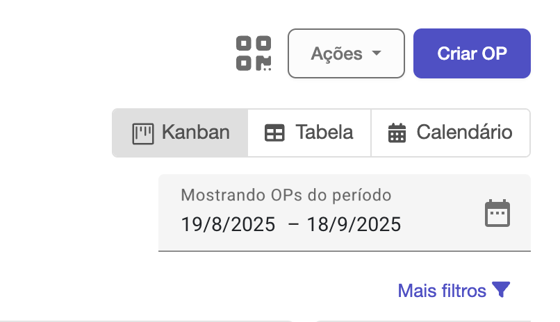 A tela de kanban de OPs possui um filtro de data de criação da OP, que por padrão pega os últimos 30 dias.